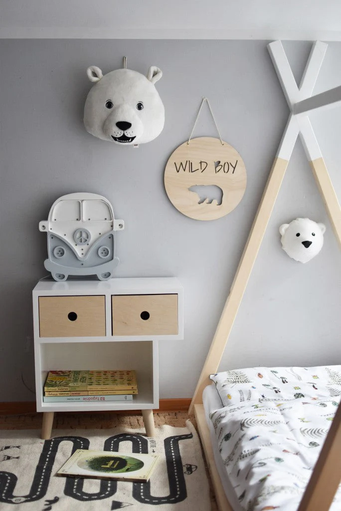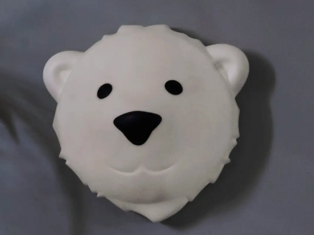 Une veilleuse à accrocher au mur. Elle se décroche facilement pour la poser à coté du lit la nuit. Allumez la lampe en appuyant sur le nez de l’ours polaire, puis elle change de couleur (4 différentes). La lampe s’éteint automatiquement après 15 minutes, mais peut également rester allumer toute la nuit.