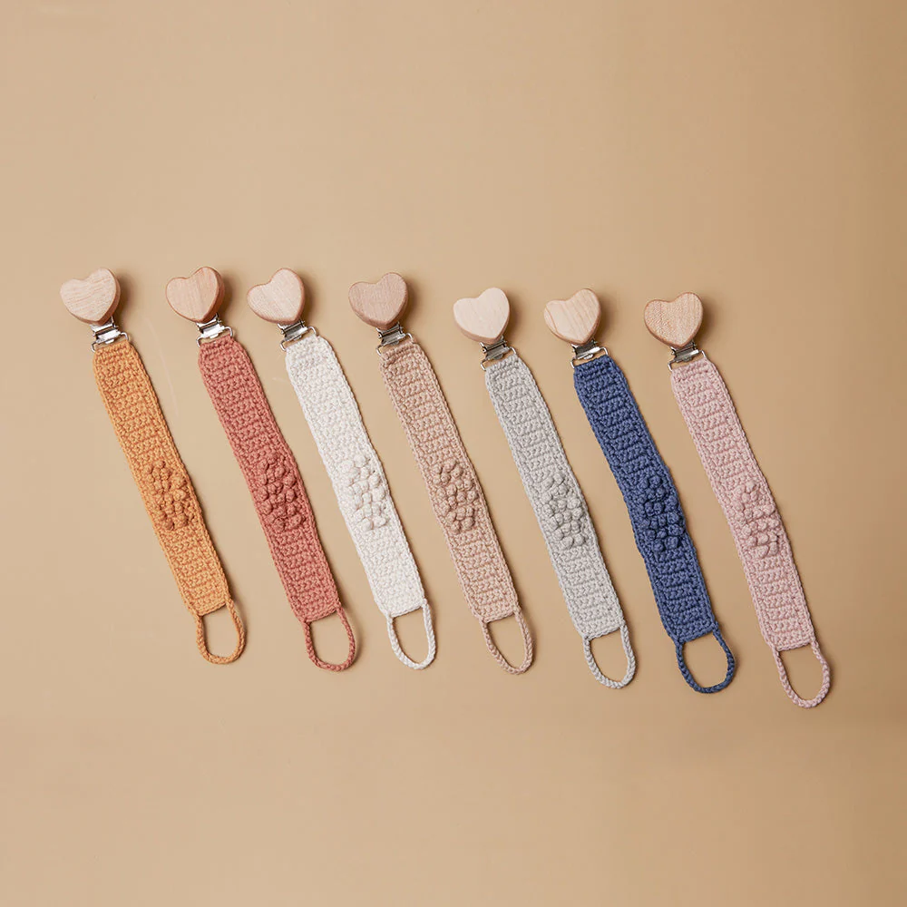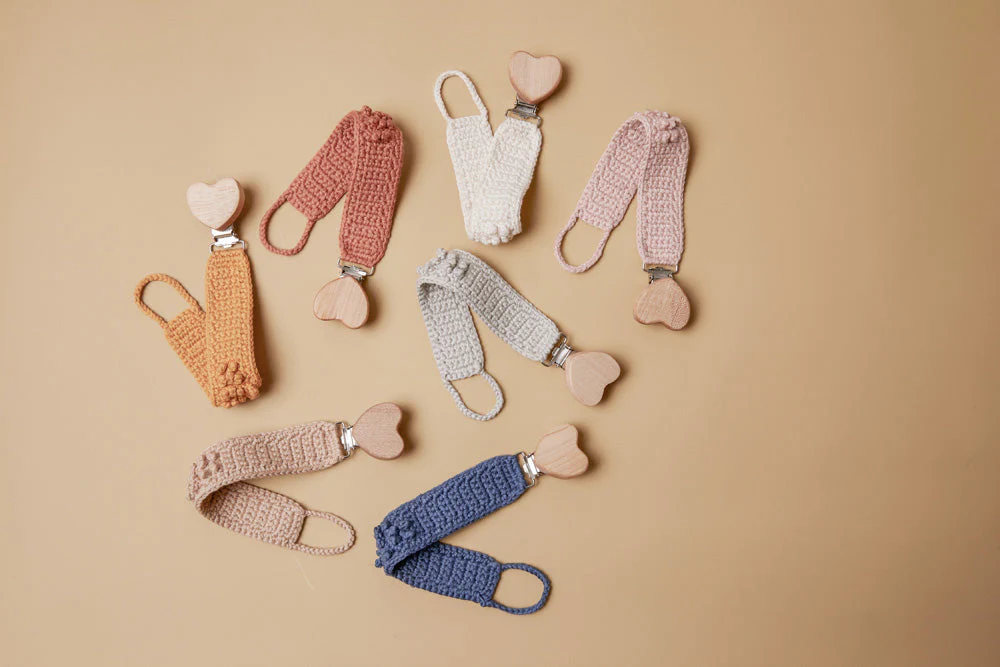 Voici de magnifiques attaches-sucette en crochet et bois d’érable. Un design classique dans des couleurs tendances.