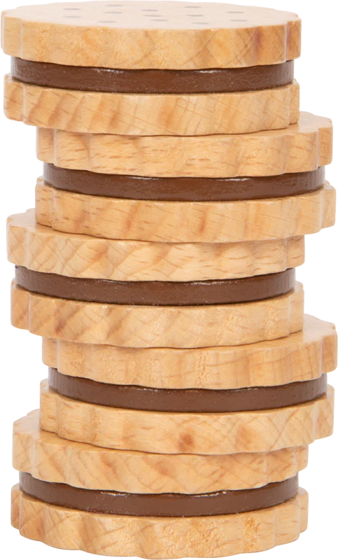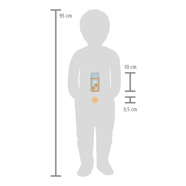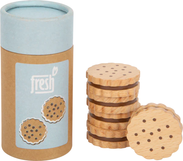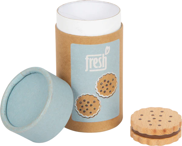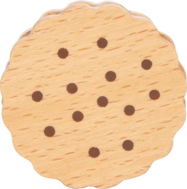 Pour les petits monstres en miettes ! Ces 5 biscuits doubles robustes en bois enrichissent l’assortiment de confiseries de chaque magasin ! Dans la boîte ronde stable et refermable en carton naturel avec couvercle amovible, ces biscuits pour enfants très appréciés sont en outre parfaitement présentés. Grâce à l’illustration simple sur la boîte, même les jeunes enfants qui ne savent pas encore lire peuvent comprendre facilement. L’aspect naturel et réaliste des doubles biscuits en fait un succès dans les jeux de rôle imaginatifs du magasin et de la cuisine pour enfants ! Associés à d’autres produits alimentaires de la gamme « fresh », les produits alimentaires en bois garantissent un plaisir de jeu durable.