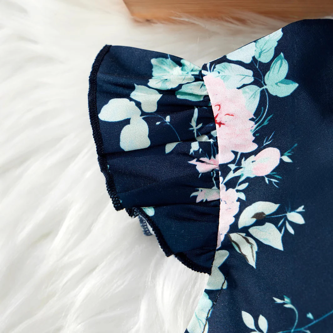Son motif floral délicat sur fond bleu marine apporte une touche de poésie, tandis que ses manches à volants ajoutent une note de douceur irrésistible.
