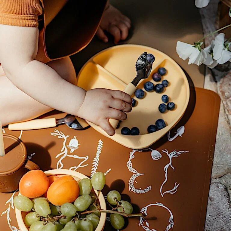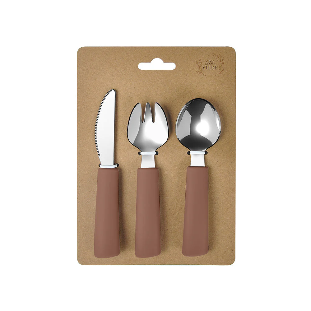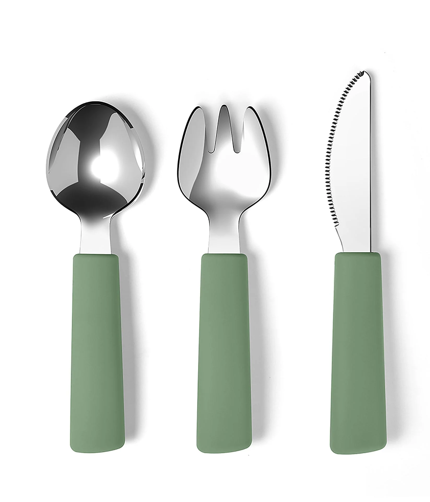 Parfaits couverts pour les enfants ayant déjà une expérience, donc pas pour les tout-petits. Apprentissage garantie. Ne pas utiliser le couteau sur du silicone. Age: 1+ Couleur: Bleu, Lila, Sauge, Terra, Terre, Vanille, Vintage Dimensions: 13 × 2 × 12 cm Made in: Chine Matériaux: Inox, Silicone qualité médicale