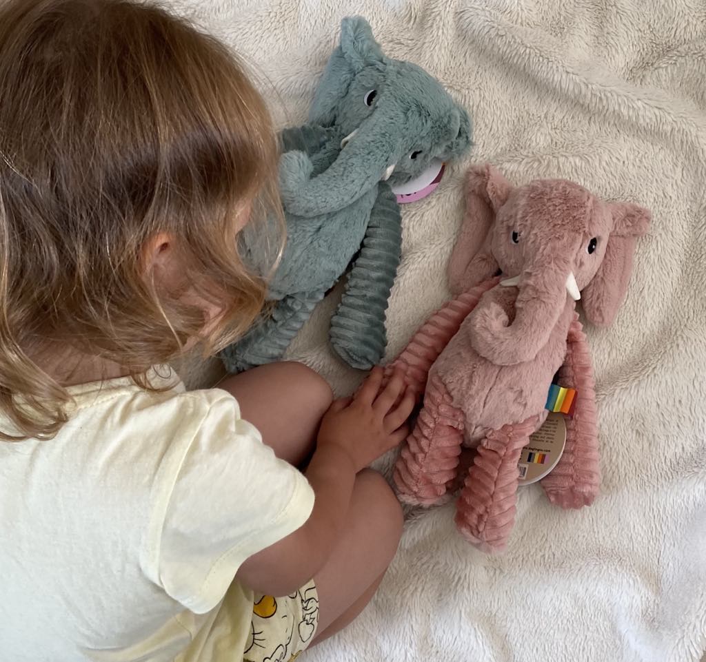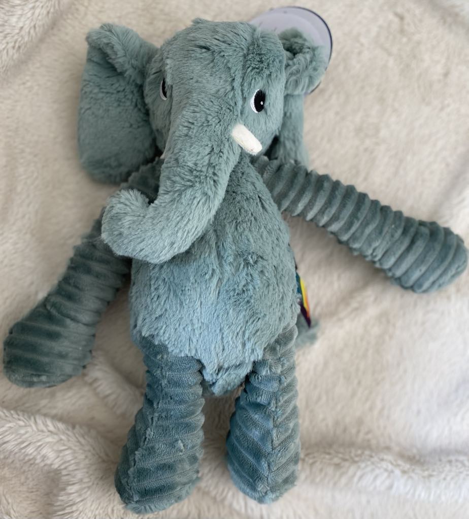 Cette peluche, grâce à ses grandes oreilles en velours à poils long est idéale pour les gros câlins. Facile à attraper par ses grandes pattes ou sa trompe, cet éléphant suivra vos minis partout.