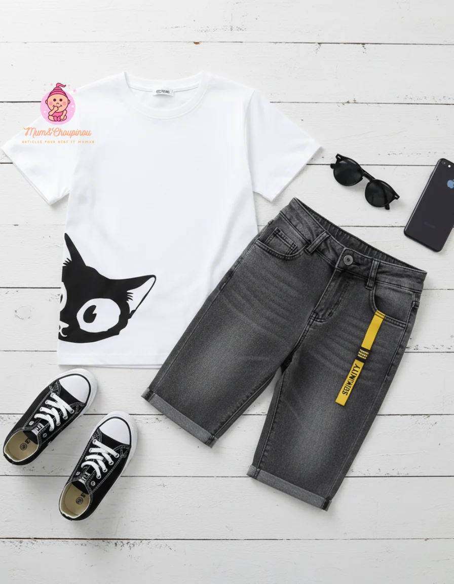 Découvrez notre ensemble T-shirt et Short pour garçon, parfait pour l’été. Matière douce, short en jean confortable et design chat fun. Disponible en 3 couleurs. Achat facile et livraison rapide !