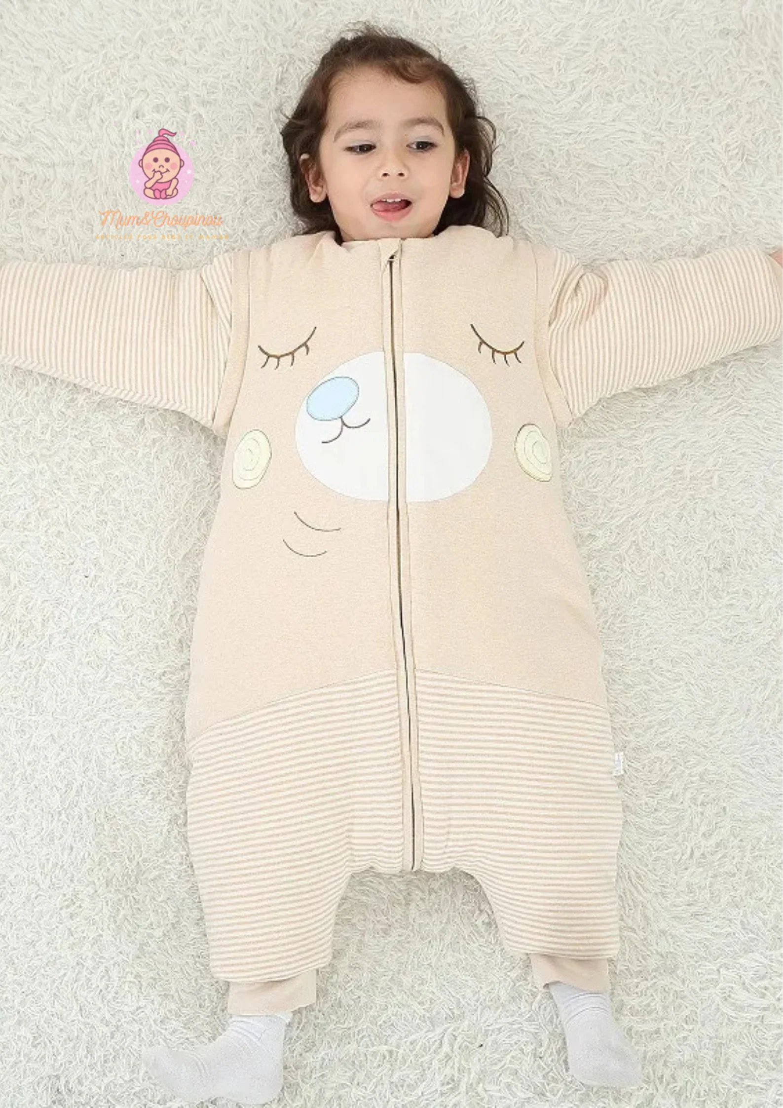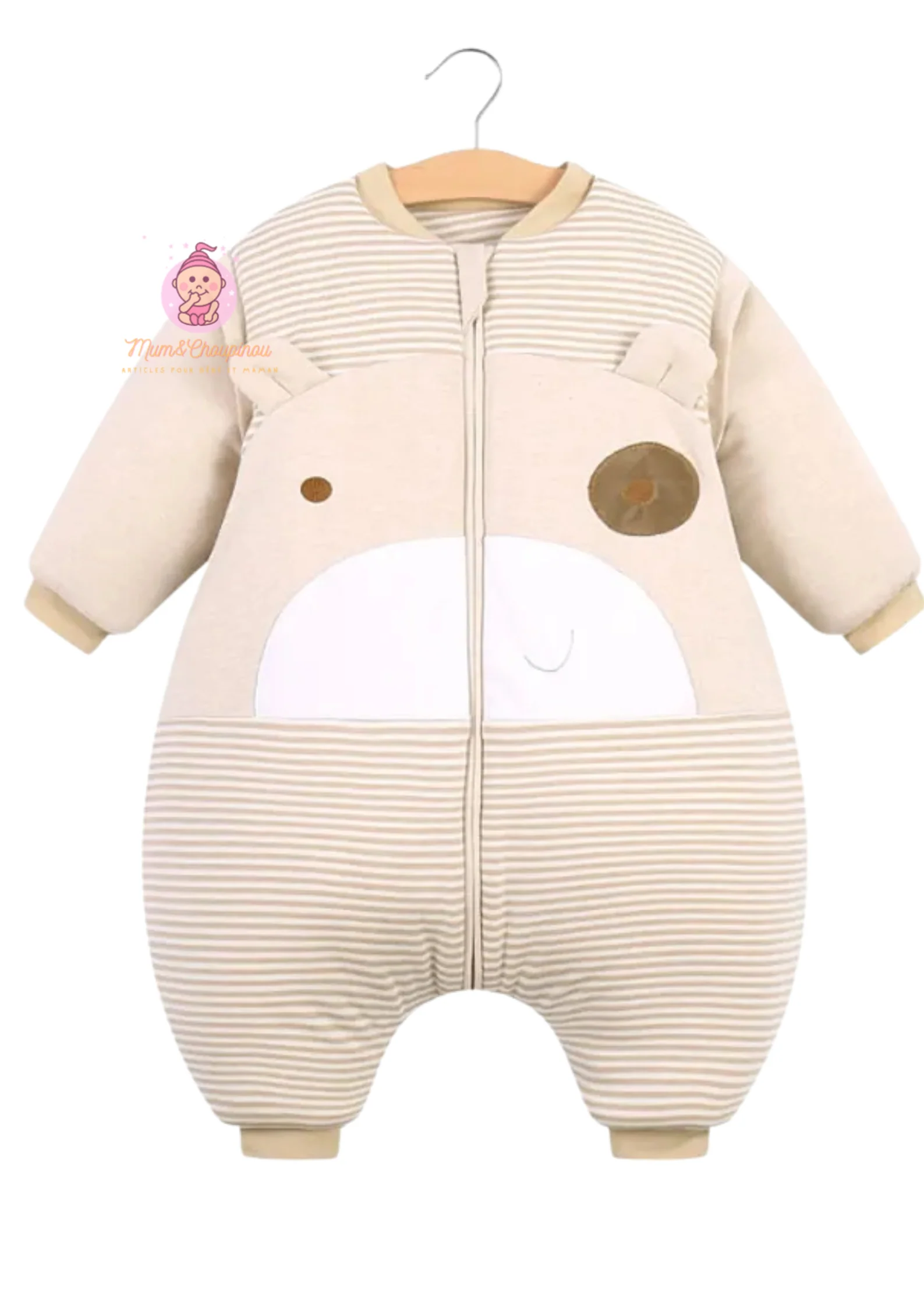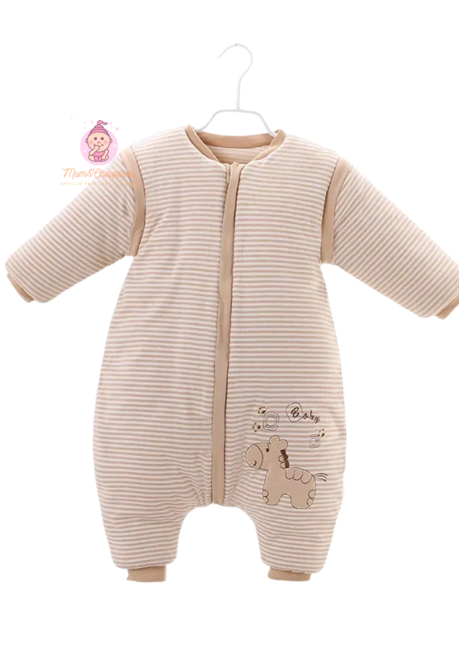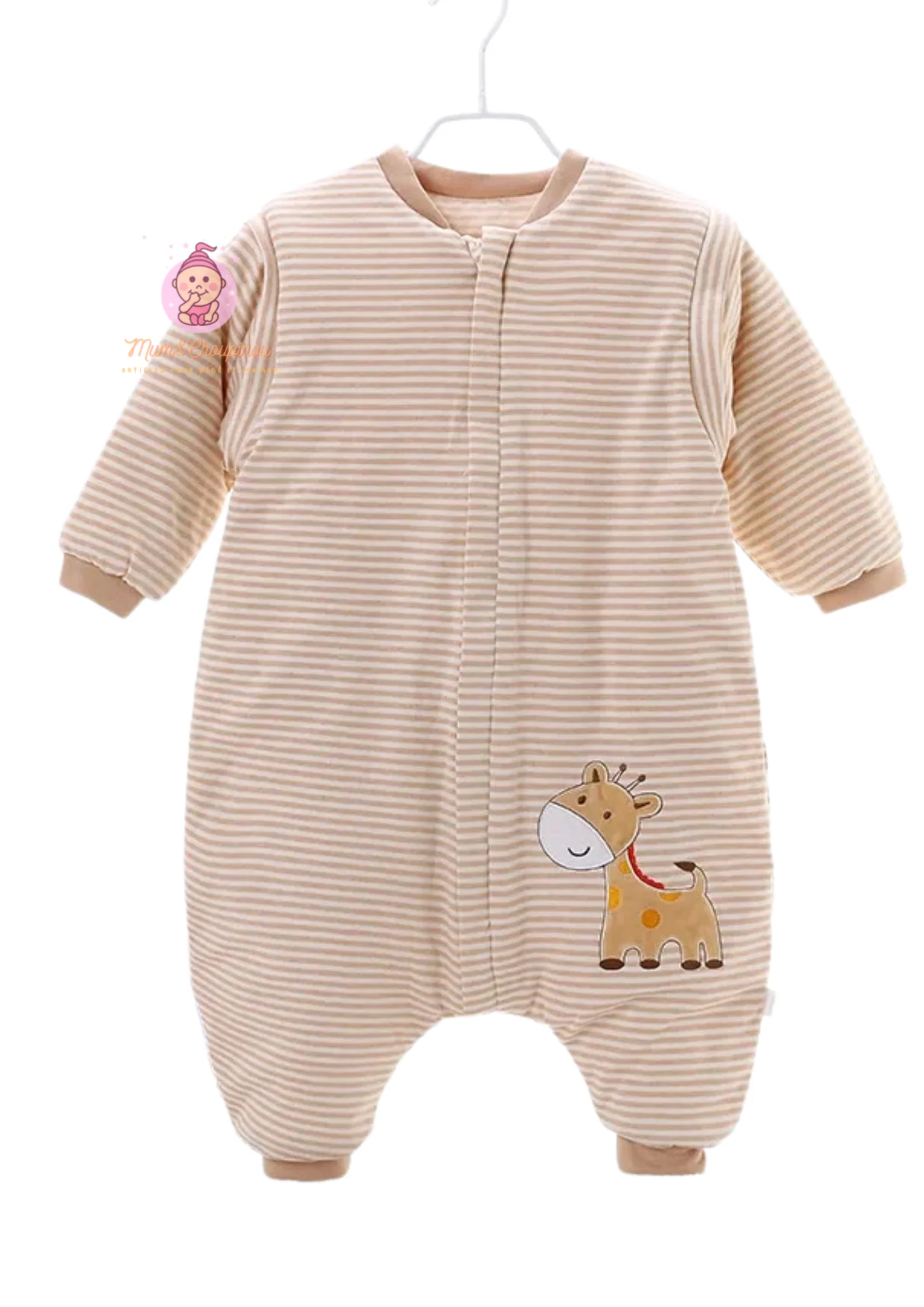 ✨ Style adorable : Déclinée en beige et taupe rayé, avec des motifs animaux craquants (ours endormi 🐻, girafe 🦒, poney 🐴).