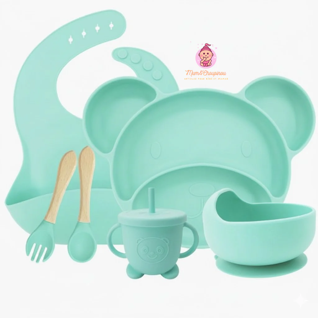 Fini le stress des repas, les couverts qui glissent et les accidents à table ! Grâce à son design “Ours” ultra-mignon, ce kit séduit autant les bébés que les parents. Il constitue un indispensable de la diversification alimentaire (DME) et une excellente idée cadeau pour bébé 🎁