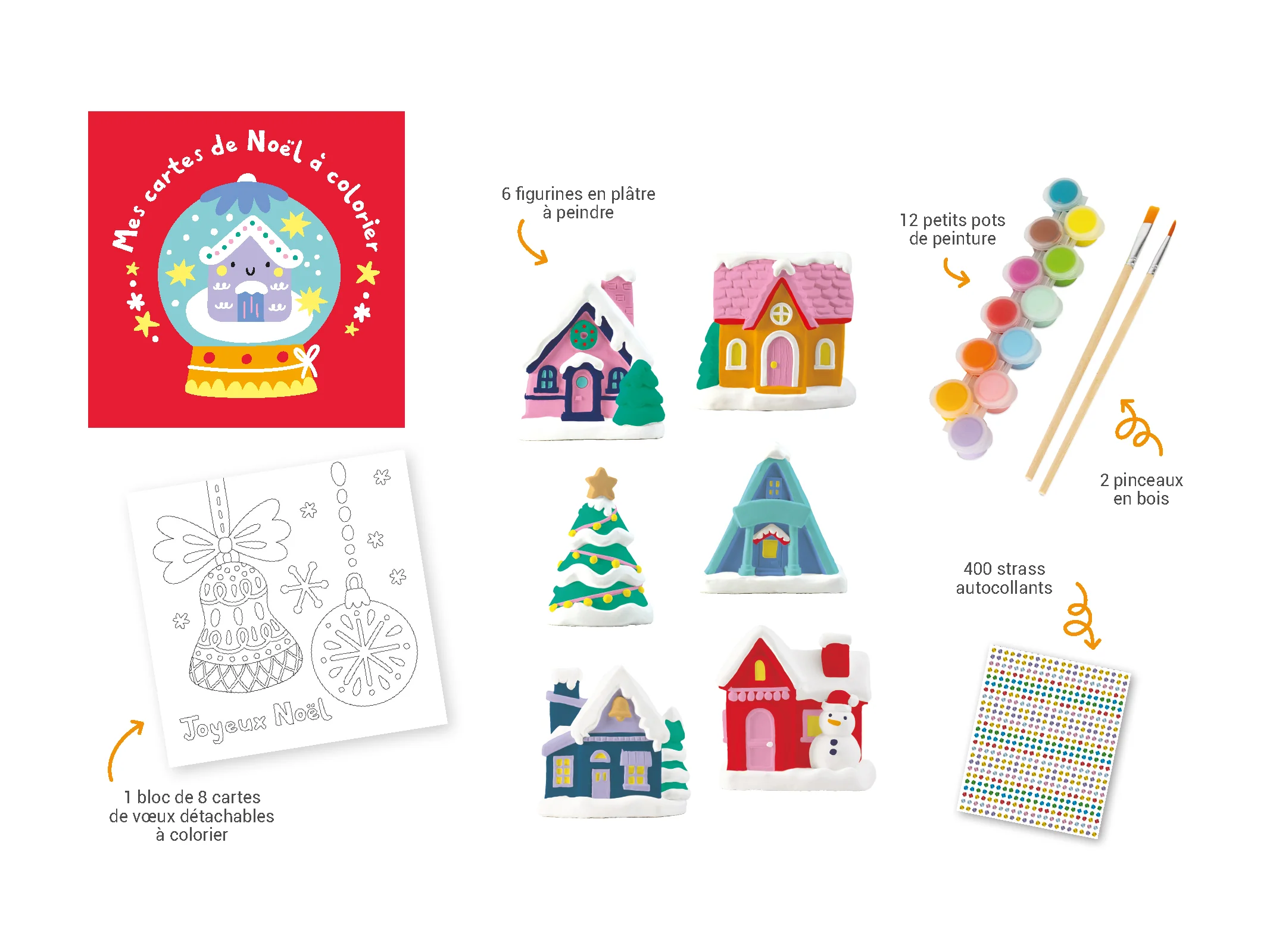 Dans ce coffret, les jeunes enfants (et les plus grands) vont trouver 5 jolies maisons en plâtre et un sapin, 12 pots de peinture, deux pinceaux en bois (un plat et un fin), 10 cartes de Noël à colorier et plus de 400 strass autocollants. Un super atelier créatif pour décorer la maison avant Noël !