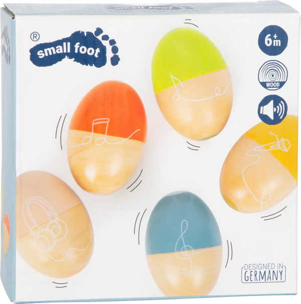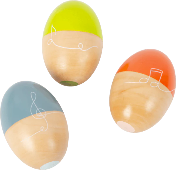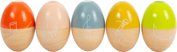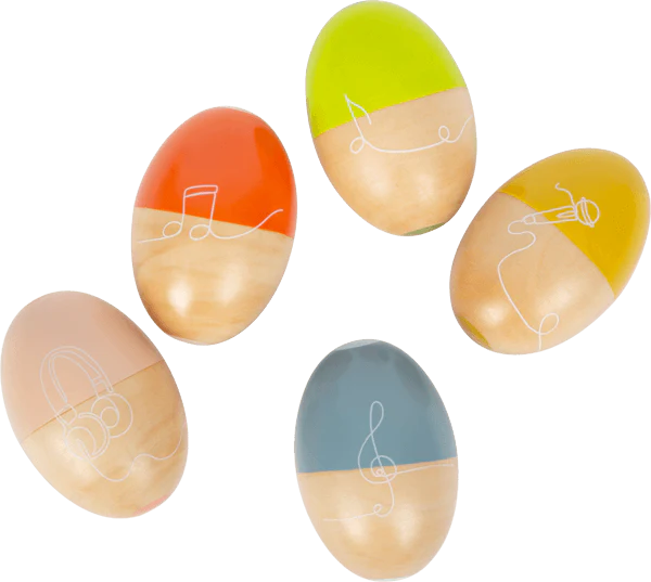 Secouer, secouer, faire de la musique : En avant la musique avec ces œufs ou maracas de musique ! Chacun des cinq œufs à secouer, fabriqués en bois massif robuste, émet un son différent et procure beaucoup de plaisir rythmique. Les œufs de belle forme sont particulièrement faciles à saisir pour les mains d’enfant. Et aussi visuellement, les œufs musicaux, avec leur combinaison de bois naturel et de couleurs contrastées modernes, attirent le regard dans le groupe de musique de la chambre d’enfant !