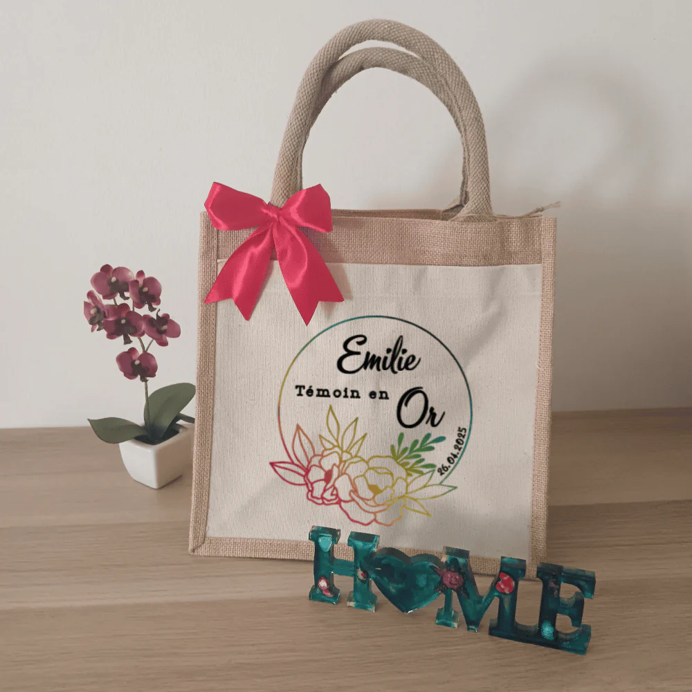 Remerciez vos proches avec un sac en jute chic et naturel, personnalisable avec les prénoms, la date du mariage ou un petit mot doux. Idéal comme sac de bienvenue pour les invités ou comme cadeau d’honneur pour témoins, demoiselles et garçons d’honneur.