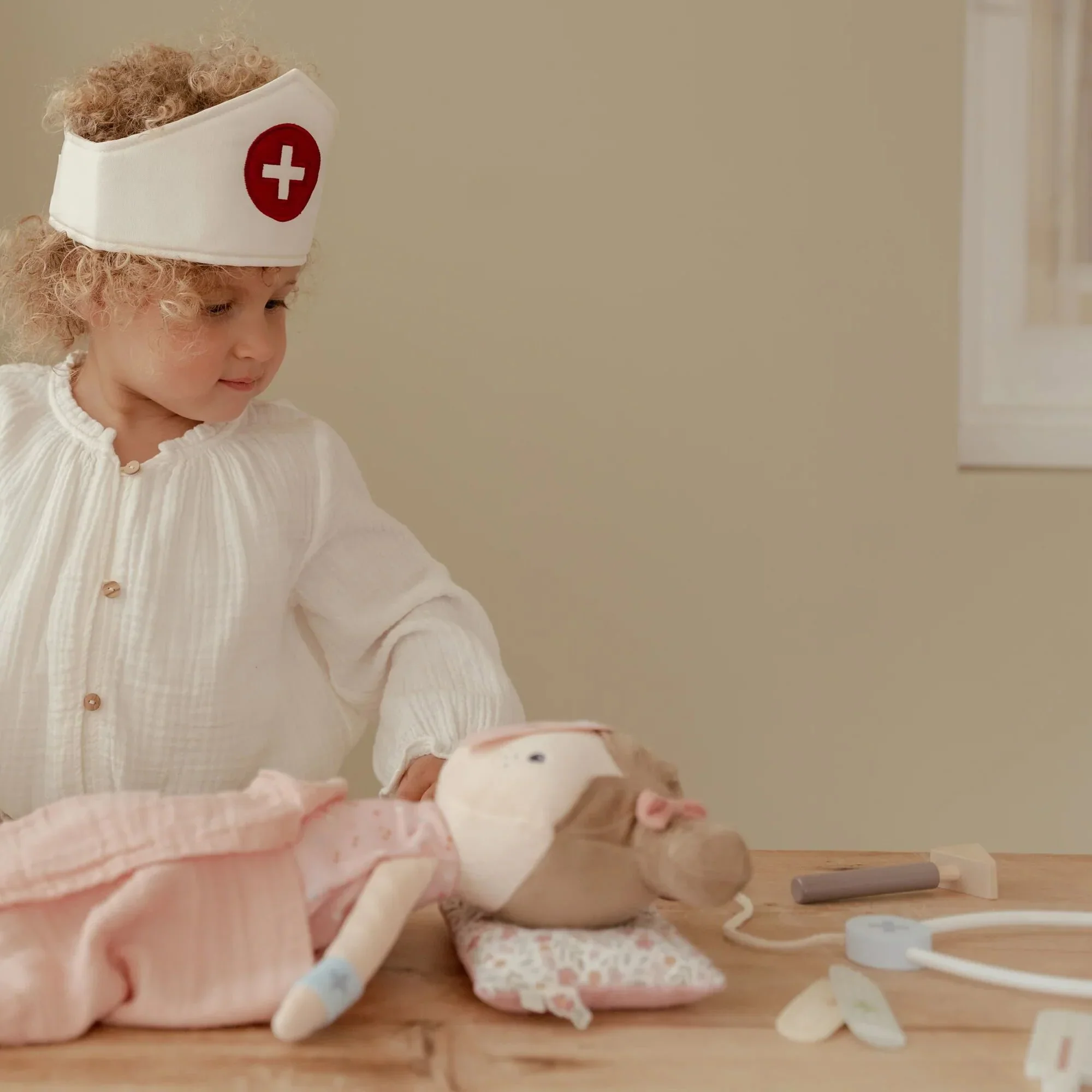 Docteur, pouvez-vous jeter un Å“il ? Avec cet ensemble complet de médecin en bois, votre petit est entièrement prêt à soigner les patients. Dans le sac de médecin en tissu se trouvent tous les outils médicaux essentiels, tels qu’un thermomètre, une seringue, des pansements, un stéthoscope et un tensiomètre. Même un petit chapeau de docteur n’est pas oublié ! Parfait pour des jeux de rôle imaginatifs et pour se familiariser avec les visites chez le médecin. Qui est le prochain patient ?