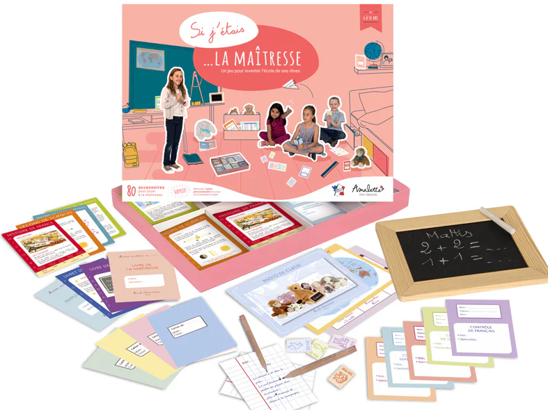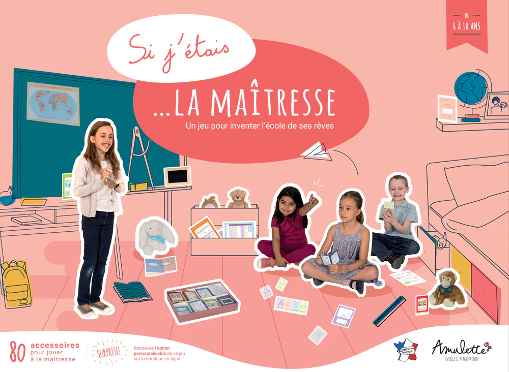 Le coffret Si j’étais la maîtresse contient tout le matériel pour imaginer la classe de ses rêves. Destiné aux enfants de 6 à 10 ans, il leur permet de se projeter avec allégresse dans le rôle du maître ou de la maîtresse seul avec leurs doudous ou à plusieurs. Il reflète de façon décalée la vraie vie de l’école élémentaire, ses rituels et ses programmes scolaires.