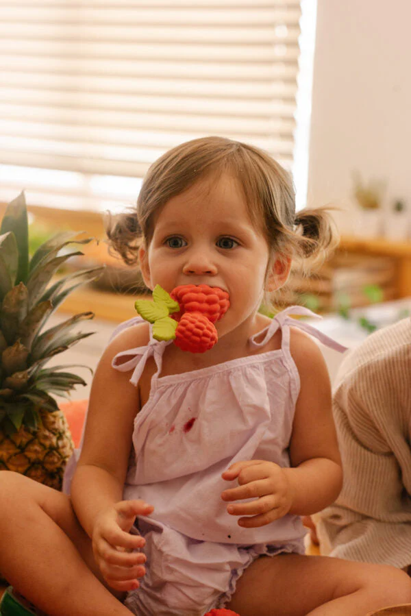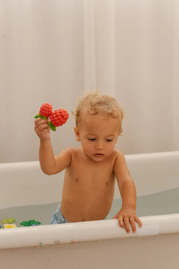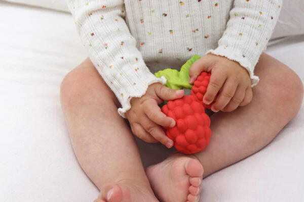 Valery la framboise : sa couleur vive et sa texture en font un jouet très attirant pour les petits.